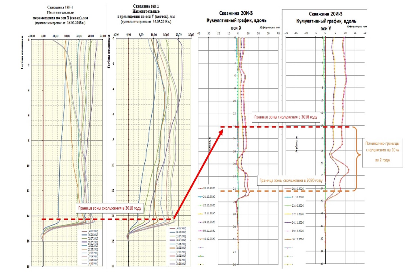 Рис. 1. Результаты сравнения инклинометрических наблюдений за период с 2018 по 2020 г. Зафиксировано понижение границы скольжения оползневого тела с 10 м до 24 м.