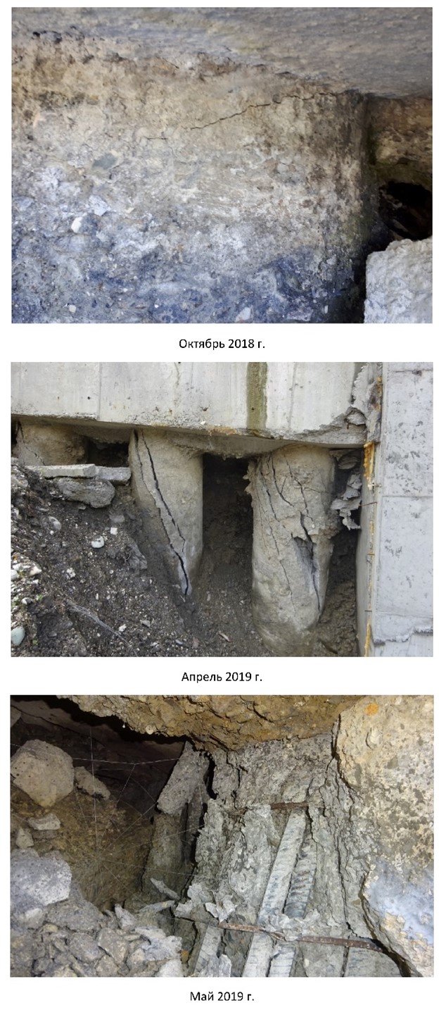 Май 2019 г. – полное разрушение защитного слоя бетона, деформация арматурного каркаса