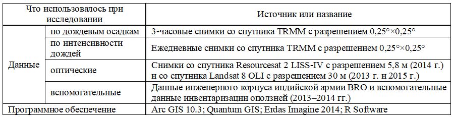 В качестве основного источника данных по атмосферным осадкам были использованы обработанные результаты измерений интенсивности дождей через каждые 3 часа и их продолжительности по ежедневным наблюдениям, которые были выполнены с помощью американо-японского спутника TRMM (Tropical Rainfall Measuring Mission – «Миссия по измерению тропических осадков»). Также использовались данные по оползням, полученные в 2013 и 2014 годах Организацией приграничных дорог (Border Road Organization, BRO) – инженерным корпусом индийской армии, который разрабатывает и поддерживает дорожные сети в приграничных районах Индии и дружественных ей соседних странах. Плюс ко всему применялись некоторые вспомогательные данные по инвентаризации оползней в 2013 и 2014 годах.