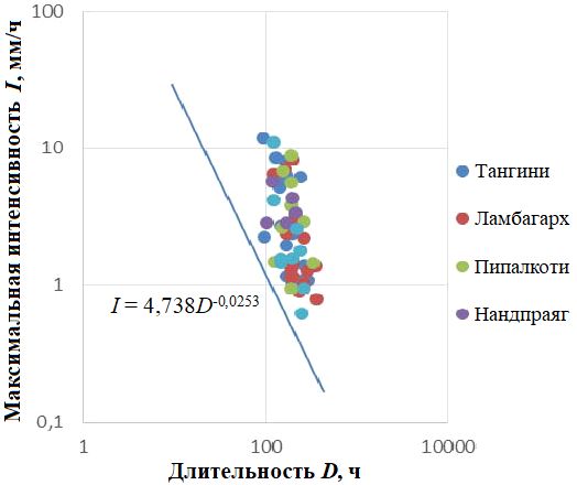 Полученный график корреляционной связи между максимальной интенсивностью дождевых осадков в день возникновения оползня (мм/ч) и продолжительностью непрерывного дождя вплоть до дня оползневого события D (ч) в логарифмическом масштабе представлен на рисунке 2. По его нижней ограничивающей линии была установлена следующая связь: