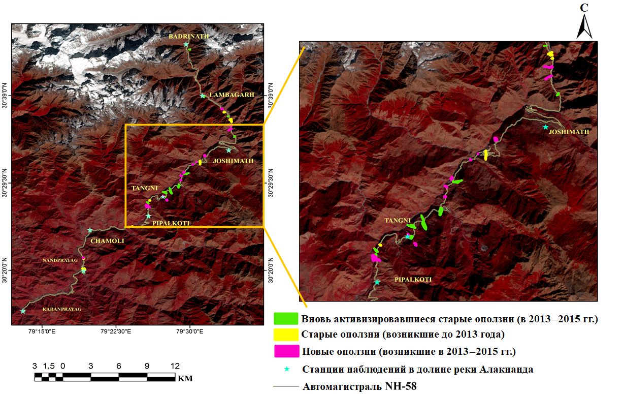 Известно, что по всему Гималайскому хребту происходят оползни, вызываемые дождями. Основная цель представленного исследования – определение пороговой для инициирования оползней корреляционной связи между максимальной интенсивностью дождевых осадков в день возникновения оползня I (мм/ч) и длительностью непрерывного дождя до оползневого события D (ч), поскольку такую связь можно использовать в качестве важного компонента системы раннего предупреждения об оползневой опасности. Работа выполнялась для территории вдоль участка Федеральной Автомагистрали 58 (National Highway 58, или NH-58) между городами Карнапраяг и Бадринатх в Гархвальских Гималаях – горных хребтах в штате Уттаракханд на севере Индии.