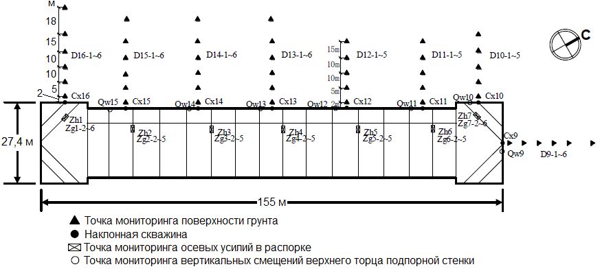 Чтобы полностью понять деформационное поведение глубокого котлована во время строительства, при его создании выполнялся комплексный мониторинг. В основном отслеживались горизонтальные (с помощью наклонной скважины) и вертикальные смещения подпорной стенки, осевые усилия в распорках, осадки дневной поверхности, окружающих зданий, проходящего поблизости трубопровода, дна котлована, а также уровни подземных вод.