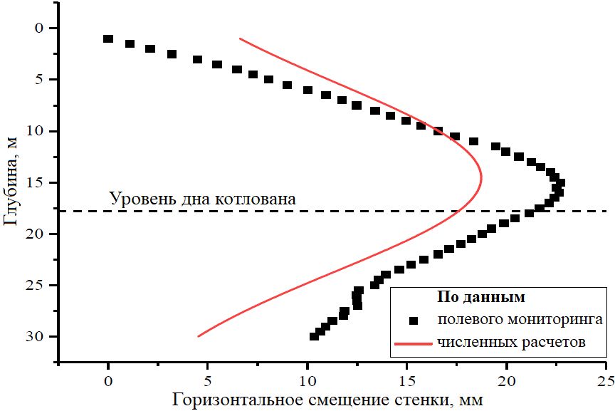 Из данных полевого мониторинга и численного моделирования видно, что максимальное горизонтальное смещение «стены в грунте» при откопке котлована до дна происходит примерно на 5 м выше дна котлована.
