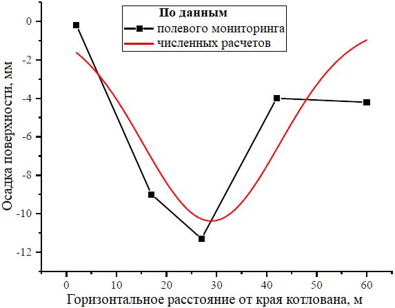 Результаты конечноэлементного моделирования горизонтальных смещений подпорных стенок и осадок поверхности вокруг котлованов при выемке грунта до дна хорошо согласуются с данными полевого мониторинга.