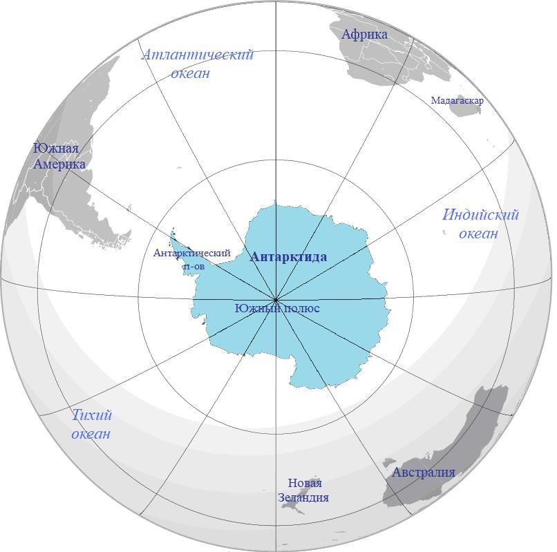 Рис. 1. Расположение Антарктиды на глобусе. Вид со стороны Южного полюса (по [32])