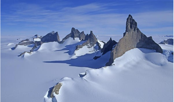 Рис. 7. Лишь верхние части некоторых гор выступают над ледяным покровом Антарктиды [42]
