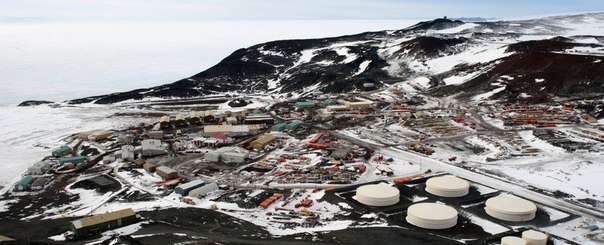 Рис. 11. «Столица белого континента» Мак-Мёрдо на острове Росса в одноименном море рядом с побережьем Антарктиды. Там постоянно проживает около 1300 чел., имеются 3 аэродрома, морской порт, большое количество колесного и гусеничного транспорта и прочей техники, 100 строений, в том числе электростанция, исследовательский центр, жилые здания, теплицы для выращивания овощей, установка для перерабатывания отходов, работают спутниковые телевизионные каналы и интернет [37]