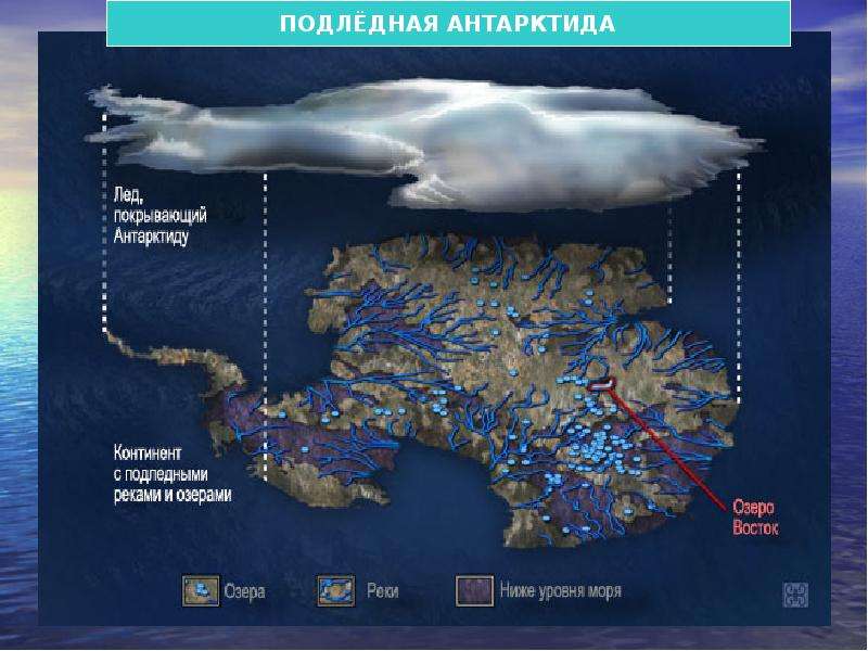 Рис. 19. Незамерзающие озера и реки, скрытые под ледниковым покровом Антарктиды [21]