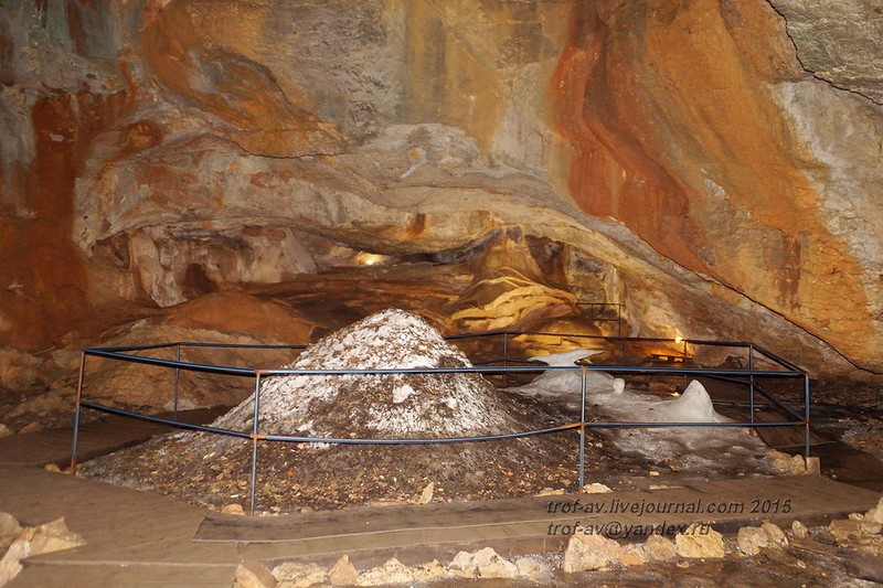 Главная достопримечательность этой пещеры – постоянный ледяной конус, достигающий в высоту 7 м. Образовавшаяся при его таянии вода разливается по полу и замерзает, постепенно превращаясь в прослои ископаемого льда мощностью в несколько метров. На его поверхности можно увидеть блестящие монетки, которые оставили многочисленные туристы, посещающие эту пещеру Крыма.