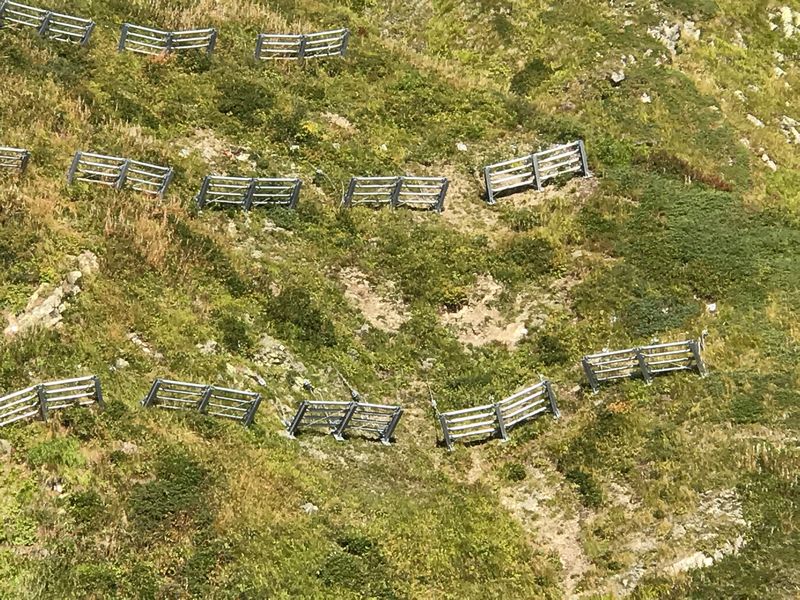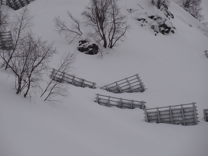Рис.1. Эти барьеры «гаражной сборки» простояли около 5 лет. Каждое лето их, по сути, отстраивали заново. В 2017 году по границе барьеров сформировалась лавина, завершившая их мучения