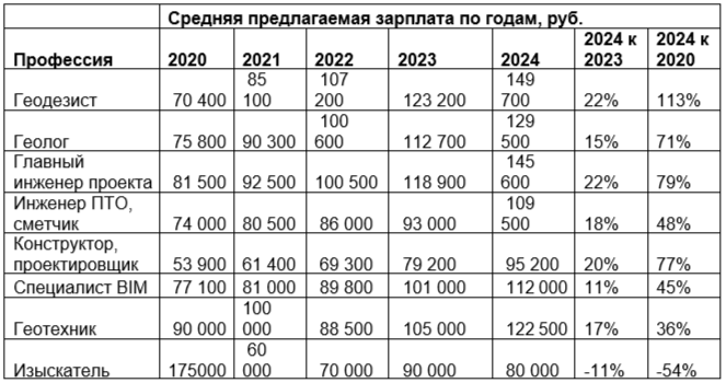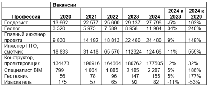 Количество вакансий главных инженеров проекта увеличилось на 9% в 2024 году, относительно 2023 года, и на 149% в сравнении с 2020 годом. Количество предложений для геотехников увеличилось на 5% за год и на 177% с 2020 года.