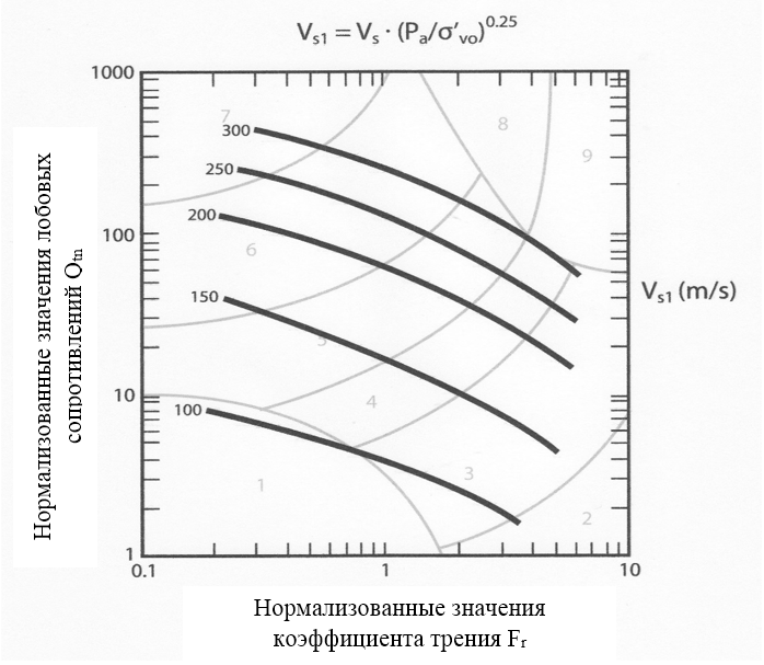 Рис. 1. Классификационная зональная диаграмма связи нормализованных значений скоростей поперечных волн Vs1 и типовых моделей грунтов координатах Qtn и Fr [7]