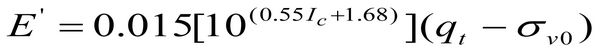 Очень существенным достижением в области приложения результатов зондирования к оценке деформационных свойств грунтов является установленная зависимость между модулем упругости E’ и чистым сопротивлением конусу (qt – σv0), подтверждённая на большом массиве данных по несцементированным силикатным пескам четвертичного возраста, когда Ic <2,6 [7]:(12)