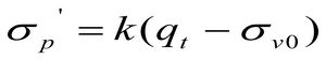 Как было отмечено выше, оценка состояния тонкозернистых грунтов и соответственно выход на их типовые модели требуют тщательного палеофациального анализа через определение коэффициента переуплотнения КПУ (OCR). Для вычисления данного показателя (см. ф. 15) необходимо знать историю литификации грунта и особенно роль цементации в процессе формирования структурных связей. Для грунтов, которые достигли определённой степени литификации, коэффициент переуплотнения представляет собой отношение напряжения на пределе текучести (максимальное напряжение, определяющее пластическое течение) к действующему эффективному напряжению, вызванному весом перекрывающих слоёв, при этом следует учитывать направление действия и тип нагрузки. По предложению Кулхейви и Мейна (Kulhawy and Mayne, 1990) генетически предопределённый предел напряжения текучести σ’р можно определить по формуле [15]: