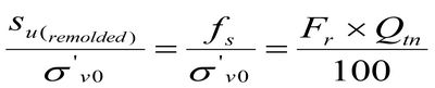 Для тонкозернистых глинистых грунтов установлено, что нормализованные значения сопротивления конусу Qtn и коэффициента трения Fr определяются не только степенью консолидации, устанавливаемой по коэффициенту переуплотнения КПУ (OCR), но и чувствительностью грунта St. Эта зависимость была исследована на основе установленной прямой связи боковых сопротивлений при зондировании со значениями недренированного сопротивления прямому сдвигу для перемятых глинистых грунтов. В высокочувствительных грунтах даже незначительные нарушения естественного сложения приводят к изменению показаний муфты трения, которые хорошо коррелируют со значениями сопротивления недренированному прямому сдвигу (Lunne at al., 1997) [4].