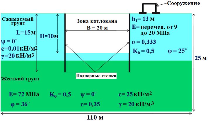 Было выполнено численное моделирование для общего анализа взаимодействий в системе «котлован – подпорная стенка – грунт – соседнее сооружение» на основе метода конечных элементов с учетом упругопластического поведения грунта и того, что модуль Юнга E слоя грунта 1 (рис. 1) увеличивается с глубиной в соответствии со следующей формулой: