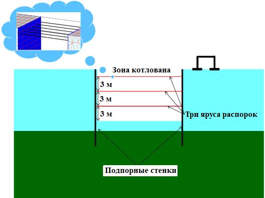 Рис. 3. Схематический вертикальный разрез котлована с системой горизонтальных распорок для поддержки подпорных стенок [7]