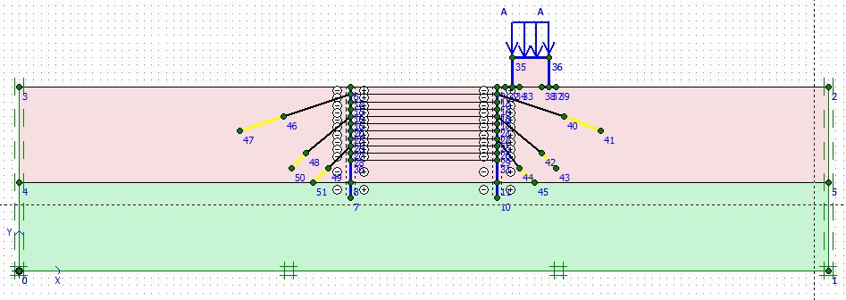 Вариант 2. Постоянные грунтовые анкеры. Такая система укрепления подпорной стенки позволяет проводить строительные работы в зоне вынутого грунта. Что касается свойств грунтовых анкеров, то необходимы два набора данных: по типу анкеров и по типу их размещения. Для стержня (тяги) анкера (между узлами) нормальная жесткость EA=2*105 кН, шаг составляет 2,5 м, Fmax,comp=1*1015 кН, Fmax,tens=1*1015 кН. Для корня анкера нормальная жесткость EA=1*1015 кН/м (рис. 4). Расстояние между двумя последовательными ярусами анкеров в вертикальной плоскости равно 3 м.