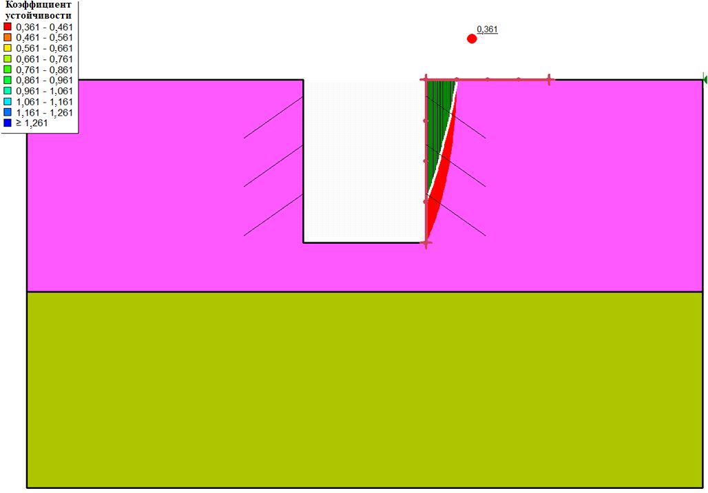 При анализе методом предельного равновесия требуется множество пробных поверхностей скольжения, чтобы найти критическую поверхность скольжения, соответствующую наименьшему значению коэффициента (запаса) устойчивости (рис. 5). После этого, а также для того, чтобы сделать глубокий котлован устойчивым при отсутствии или наличии расположенного рядом наземного сооружения, одним из предлагаемых решений является использование грунтовых анкеров. Можно учесть эффекты усиления грунта анкерами (см. рис. 4). Необходимы расчет усилия вытягивания (выдергивания), задание длины анкеровки, наклона осей анкеров и многих других параметров.