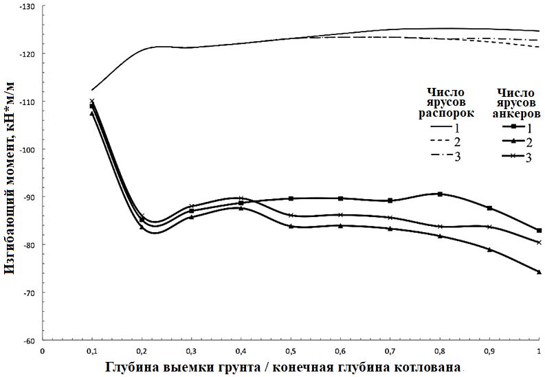 Изменения изгибающего момента в середине пролета описанного выше наземного сооружения в конце выемки грунта из котлована (см. рис. 1) имеют более низкие значения (от 33 до 38%) при использовании для поддержки подпорных стенок системы грунтовых анкеров (рис. 6).