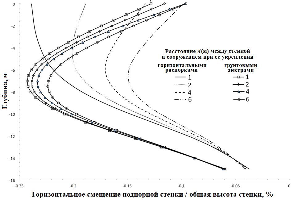 Как показали параметрические исследования, горизонтальные смещения подпорной стенки уменьшаются при увеличении расстояния между котлованом и соседним сооружением. Эти исследования также показали, что максимальные смещения подпорной стенки при ее поддержке горизонтальными распорками происходят ближе к ее верхней части, а при укреплении грунтовыми анкерами – ближе к ее середине (рис. 8).