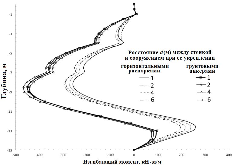 Максимальные изгибающие моменты подпорной стенки достигаются не на уровне дна котлована, а на глубине около 8 м. Причем они больше в случае применения грунтовых анкеров, а также при увеличении расстояния до соседнего сооружения (но лишь до определенного расстояния, начиная с которого максимальные изгибающие моменты начинают уменьшаться) (рис. 9).