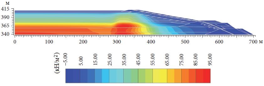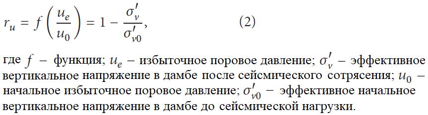 Зоны разжижения в дамбе были выявлены путем оценки коэффициента избыточного порового давления ru, который определяется следующим образом [20]: