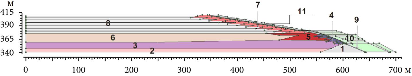 Рис. 3. Конечноэлементная модель дамбы E-F: 1 — исходный ярус дамбы из моренных отложений; 2 — мягкие песчаные хвосты; 3 — слоистые песчаные хвосты; 4 — ярусы наращивания из моренных отложений; 5 — уплотненные песчаные хвосты; 6 — мягкие песчаные хвосты; 7 — ярусы наращивания из уплотненных песчаных хвостов; 8 — слоистые песчаные хвосты; 9 — фильтр; 10 — насыпные бермы из каменного материала; 11 — каменная наброска (защита от внешней эрозии)