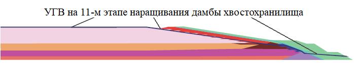 Рис. 5. Расположение уровня грунтовых вод (УГВ) на 11-м этапе наращивания дамбы E-F