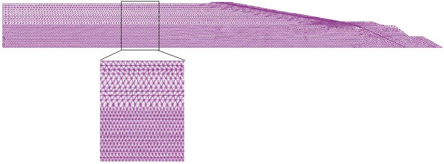 На рисунке 6 показана сетка конечных элементов, принятая для анализа. В ней были использованы 15-узловые треугольные элементы, которые дают для смещений интерполяцию четвертого порядка [18]. Всего использовалось 14 077 элементов. Средний размер элемента составлял около 1,88 м. Сетка была усовершенствована по методике Кухлемейера и Лисмера [41] так, чтобы гарантировать реалистичность передачи сейсмических волн через численную модель. Горизонтальная протяженность модели была достаточно большой, чтобы минимизировать влияние сейсмических волн, которые могли бы отражаться от левой вертикальной границы.