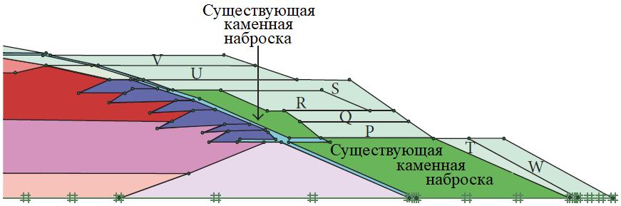 Рис. 7. Размещение насыпных берм из каменного материала P, Q, R, S, T, U, V и W