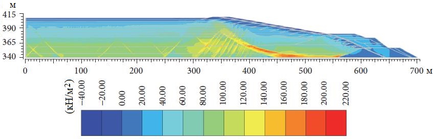 Численный анализ проводился в две стадии. Сначала был выполнен статический анализ для моделирования последовательного наращивания дамбы E-F. С этой целью был проведен анализ напряженно-деформированного состояния и консолидации [18, 39, 40] для оценки развития и рассеивания в дамбе избыточного порового давления как функции времени. Затем был выполнен динамический анализ сразу после 11-го этапа наращивания дамбы (до отметки 409 м, см. рис. 3), чтобы оценить поведение дамбы при двух различных землетрясениях. На обеих этих стадиях анализа был проведен анализ устойчивости откоса дамбы для расчета коэффициентов безопасности (запаса) и выявления зон возможных разрушений. Анализ устойчивости откоса дамбы при статическом нагружении (то есть при последовательном наращивании) более подробно описан в работе Орманна и др. [37].