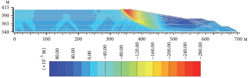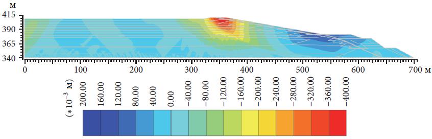 На рисунках 17 и 18 показаны прогнозируемые вертикальные смещения после сотрясения дамбы при обычном и экстремальном землетрясениях соответственно. Видно, что максимальные вертикальные смещения около 0,3 и 0,4 м в основном произошли на гребне насыпи при обычном и экстремальном землетрясениях соответственно. Такие вертикальные смещения допустимы, поскольку они гораздо меньше высоты «надводной» части внутренней стороны дамбы (расстояния по вертикали от поверхности хвостовой пульпы до гребня дамбы), которая составляет 2 м. В общем, считается, что такие величины общих смещений дамбы (см. [58]) находятся в допустимых пределах.