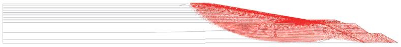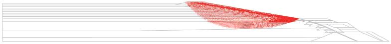 В этом типе анализа в дополнение к определению величины коэффициента устойчивости важно выявить возможные зоны разрушения, которые возникли бы в случае разрушения дамбы. На рисунках 19 и 20 показаны такие зоны, которые были определены в результате анализа постсейсмической стабильности откоса дамбы для обычного и экстремального землетрясений соответственно. Видно, что, как ни странно, зона разрушения, вызванная экстремальным сейсмическим событием, является менее протяженной и менее глубокой по сравнению с зоной, образовавшейся в результате обычного землетрясения. Это связано с тем, что экстремальное событие привело к более высоким по модулю значениям отрицательных поровых давлений и к большей прочности ярусов наращивания из морены и берм из насыпного каменного материала (см. рис. 3); поэтому зона разрушения и не распространилась на эти области.