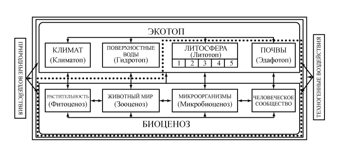 Рис. 1. Схема структуры экосистемы с учетом геологической составляющей и внешних воздействий на нее. Точками выделены границы эколого-геологической системы: 1–5 — параметры литосферы: 1 — состав, строение и рельеф; 2 — подземные воды; 3 — геохимические поля; 4 — геофизические поля; 5 — современные эндо- и экзогенные процессы [11]