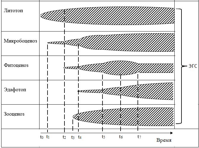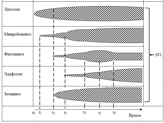 Из этой схемы следует, что литотоп – самый консервативный компонент ЭГС в смысле его динамики в физическом времени, но самый длительный по времени своего существования: массив грунтов имеет длительную геологическую историю своего развития от момента его возникновения (t0) до настоящего времени. Через некоторое время (t1) после возникновения литотопа он в первую очередь заселяется микроорганизмами и в пределах ЭГС формируется первичный микробоценоз. С появлением в ЭГС низших растений (t2), представленных лишайниками и мхами, микробоценоз расширяется в пространстве и видовом многообразии. В фитоценозе формируется начальная сукцессия, которая с появлением почв (t4) переходит во вторую стадию, затем в третью и так вплоть до стабилизации фитоценоза при достижении им климаксной стадии с момента времени (t7). К этой же стадии микробоценоз и эдафотоп также достигают своей стабилизации.