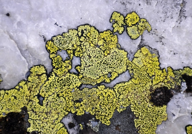Рис. 6. Таллом эпилитного лишайника (а) рода ризокарпон (Rhizocarpon) на камнях курумника (б) горы Большой Иремель, выс. 1500 м. (фото М.Скотниковой, 2019)
