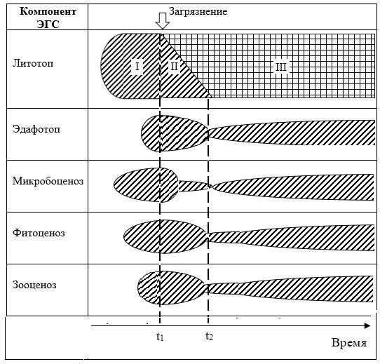 Исходный природный литотоп (см. I на рисунке 7) загрязняется не мгновенно, а в течение определенного интервала времени Δt = t2-t1. За этот интервал загрязняющийся литотоп (II) трансформируется в загрязненный (III). Загрязнение литотопа вызывает трансформацию всех компонентов ЭГС (см. рис. 7): природный эдафотоп, микробоценоз, фитоценоз и зооценоз угнетаются на интервале Δt, а затем трансформируются в новые соответствующие компоненты. При этом исходная ЭГС полностью не восстанавливается во времени, меняется видовой состав микробо-, фито- и зооценоза, уменьшается их видовое разнообразие, снижается общая численность популяций организмов, остаются лишь самые устойчивые к данному загрязнению виды. О дновременно появляются и становятся доминирующими так называемые «сорные виды» растений и животных и т.п. В этом состоит специфика динамики компонентов ЭГС при техногенных воздействиях.