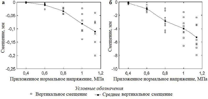 1. При одноосном сжатии нормальные смещения увеличивались при возрастании нормального напряжения. Смещения для образцов с угловатыми частицами были более значительными.