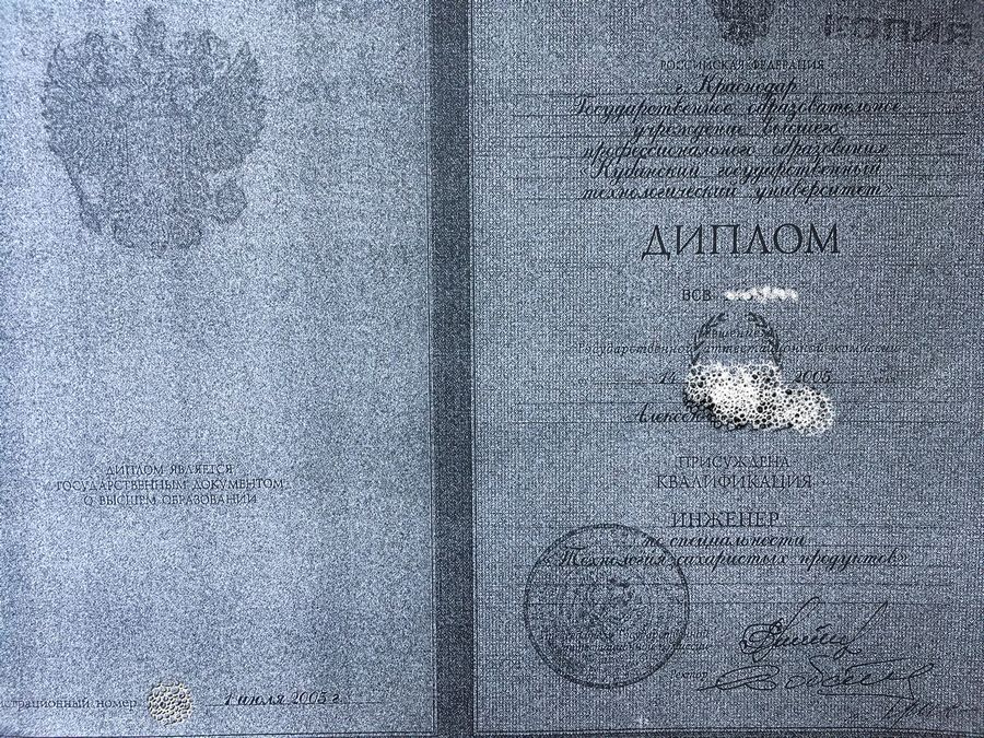 Диплом инженера по специальности «Технология сахаристых продуктов»