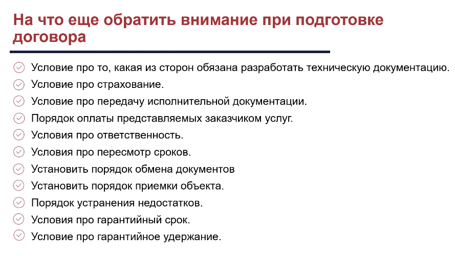 Помимо существенных условий, при подготовке договора нужно обратить внимание и на иные условия, а именно: кто будет разрабатывать техническую документацию, как она будет передаваться, каков порядок приемки работ, устранения недостатков, оплаты предоставляемых заказчиком услуг, как будет происходить пересмотр сроков, что должно быть застраховано, каков гарантийный срок и размер гарантийного удержания. Особое внимание следует уделить детальному регулированию ответственности сторон.
