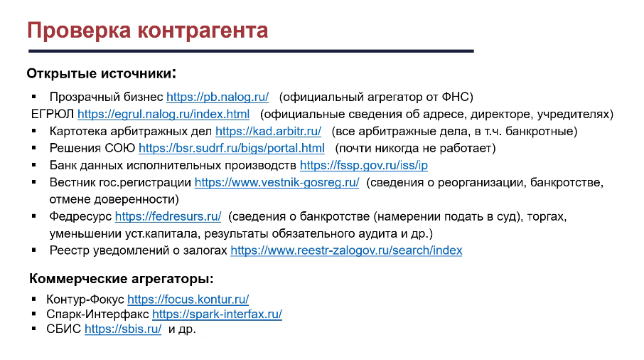 Далее Владислав Черепенин сделал акцент на проверке контрагента. Для этого используются коммерческие агрегаторы и открытые государственные и иные источники.