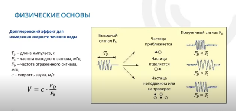Прибор собирает сигналы, отраженные от наносов. По сдвигу частоты измеряется скорость частиц и соответственно скорость воды, причем на разных уровнях. Получается распределение скоростей течения по вертикали.