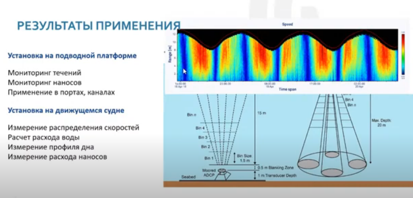 Прибор, установленный на подводной платформе, позволяет вести мониторинг течений, наносов, например, в портах, в каналах. Акустическая установка на движущемся судне измеряет распределение скоростей, профиль дна, расход воды и наносов.