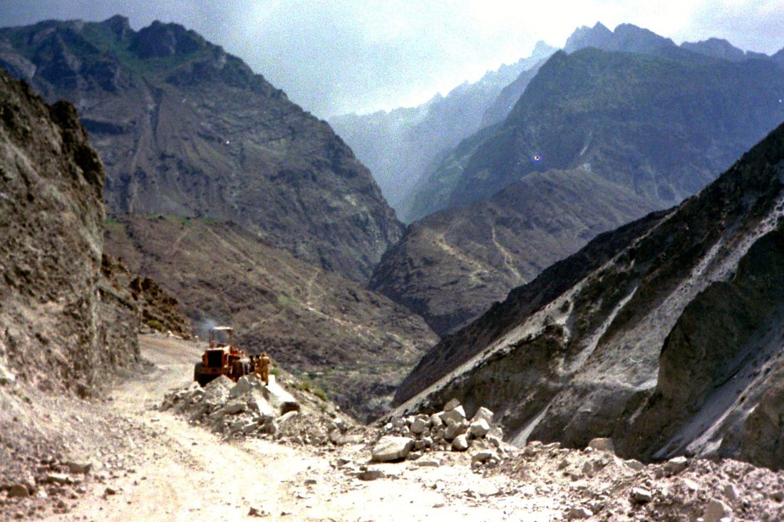 Это сейчас Китай возводит десятки грандиозных транспортных сооружений одновременно, сооружает железную дорогу в Тибет, строит крупнейшие ГЭС и даже поворачивает реки. Во второй половине 1960-х годов «Каракорумское шоссе» было действительно беспрецедентным проектом для обеих стран – предстояло создать трассу длиной в 1300 километров с 23 крупными и 70 мелкими мостами и тоннелями, дорогу, постепенно набирающую километры высоты. И сделать это предстояло в высокогорной малонаселенной, а то и вовсе безлюдной местности, в сложнейших геологических, в том числе мерзлотных условиях, при постоянных угрозах обвалов, землетрясений, лавин, при абсолютно экстремальном климате. Строительную технику порой приходилось разбирать, по частям отправлять через горные хребты, долины, перевалы и реки и вновь собирать на новом участке.