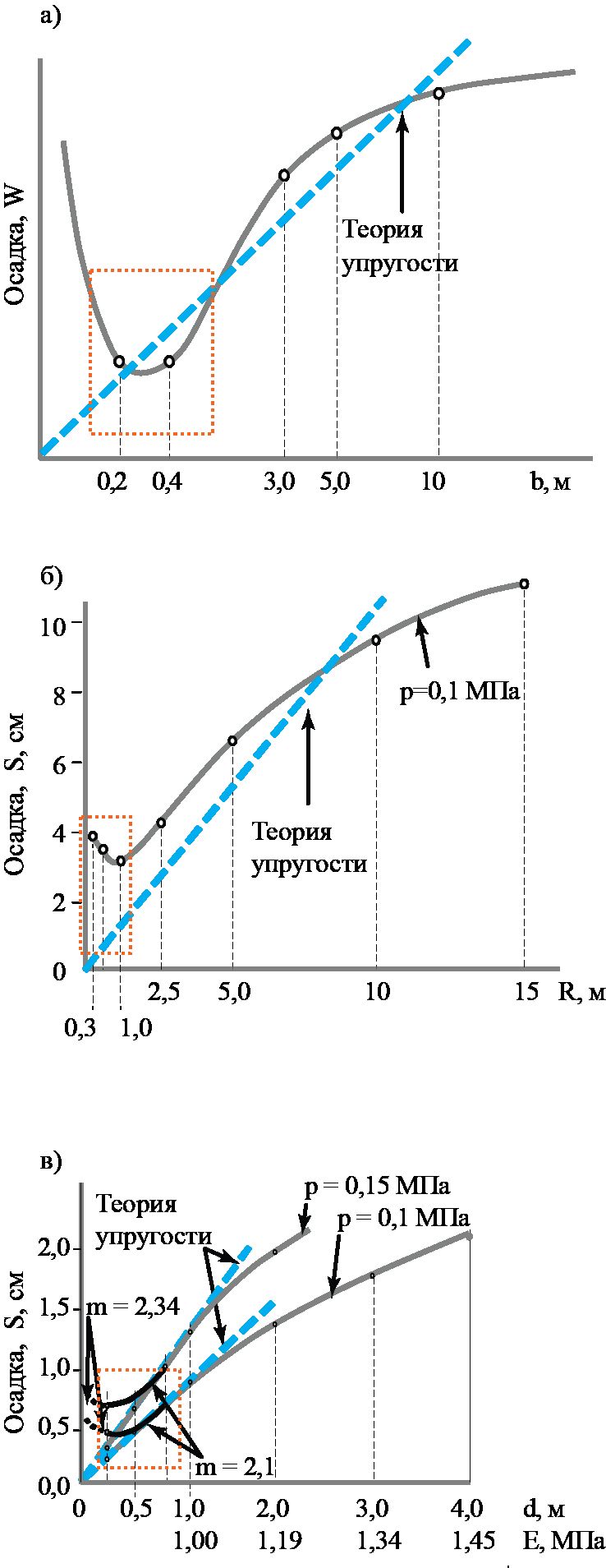 На рисунке 3в показано, что при принятом для анализа значении n = 0.3 с увеличением размера штампа модуль деформации возрастает: от Е = 1 МПа (Ао = 1 м2, диаметр d = 1.12 м) до Е = 1.45 МПа (А = 12 м2, d = 3.91 м), а для больших площадей, например А = 500 м2 (d = 25.23 м) – до Е = 2.54 МПа; соответственно зависимость S = f (d) получает нелинейный характер: она совпадает с решением по теории упругости только в небольшом диапазоне давлений, но принципиально не отличается от расчетов по нелинейным схемам.