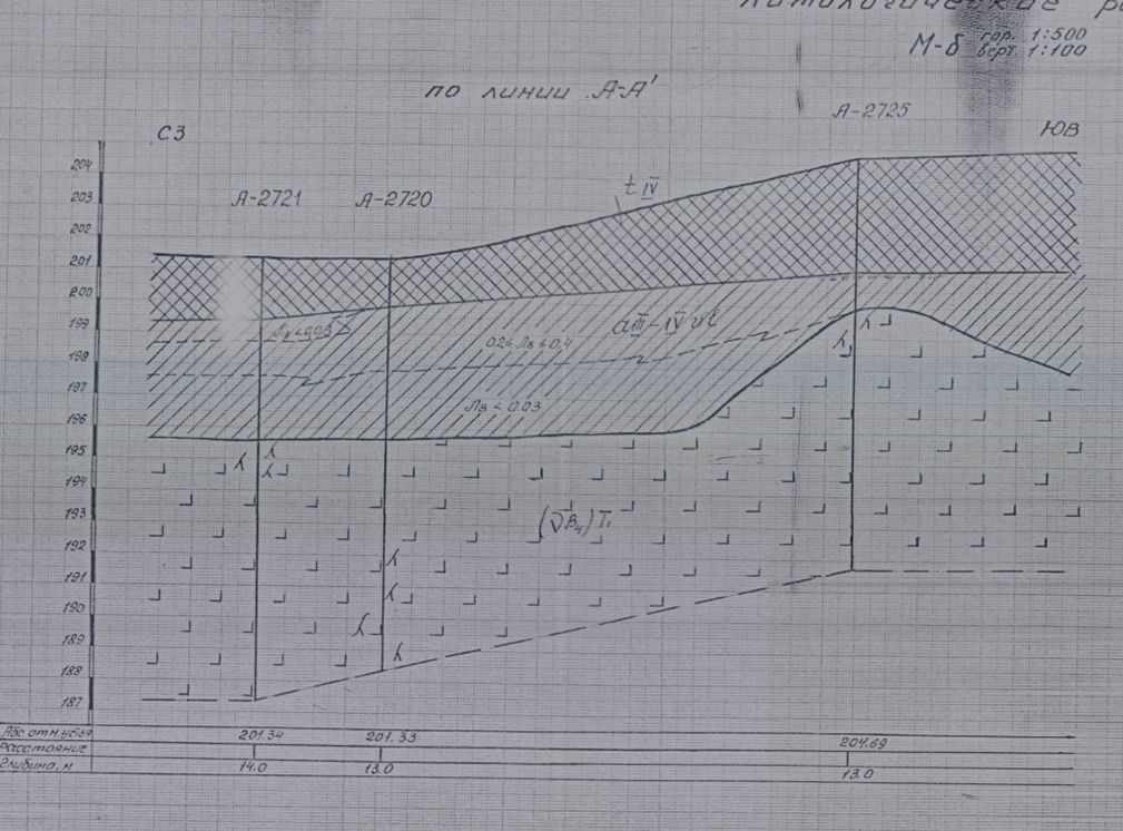 Разрез по линии А-А через центры резервуаров 4-5 свидетельствует о залегании скальных грунтов на глубинах от 4,5 м (скв. А-2725) до 6 м (скв. А-2721; А-2720):