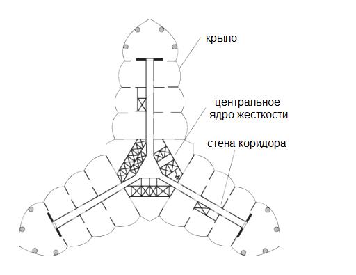 Каждое крыло с его собственной высокой несущей способностью является дополнительной опорой для двух соседних крыльев и для шестиугольного центрального ядра жесткости за счет общего железобетонного каркаса – несущих стен коридоров с еще более мощными торцовыми стенами и периметральных колонн (см. рис. 5). То есть небоскреб как бы состоит из четырех «сросшихся» башен, причем три наружных с высотой ступенчато уменьшаются в поперечных сечениях не только с носовой части, но и с одного из боков, в итоге спирально обвиваясь вокруг центрального ядра. В конце концов остается только ядро, переходящее в телескопический шпиль из металлокострукций.