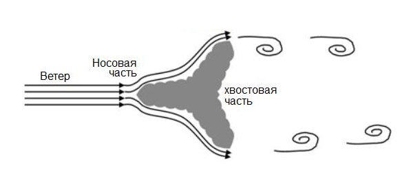 Здание ориентировано по отношению к сторонам горизонта так, чтобы преобладающие по направлению и силе ветры дули крыльям в «нос», а не между ними, то есть не со стороны «хвостов» (рис. 6). Это повышает обтекаемость башни воздушными потоками и, соответственно уменьшает силу ветрового воздействия на нее. А к тому же благодаря красивой спирально-ступенчатой конструкции удается «запутать ветер», который на каждом новом уровне встречает другую форму здания и, обтекая его, не образует с подветренной стороны единые сильные вихри, а разбивается на множество мелких (см. рис. 6).