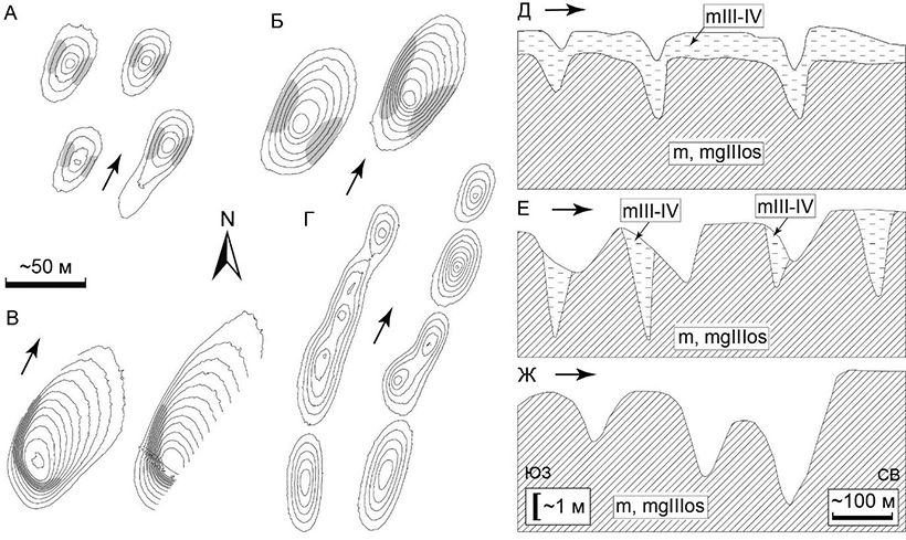 Направление депрессий 15°–195°. Глубина данных форм составляют 0,5–5 м, ширина 30–120 м, длина 90–280 м.